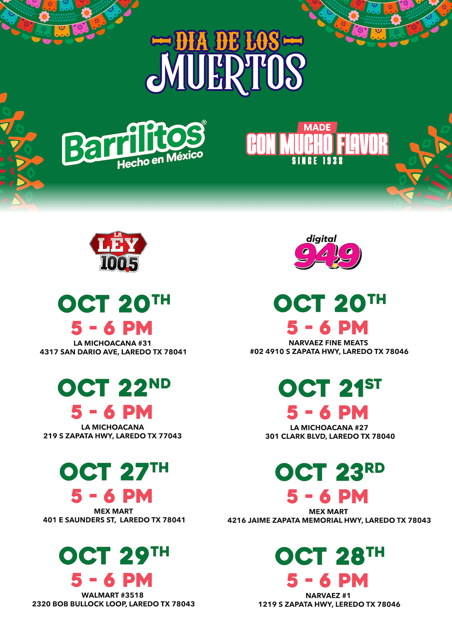 ¡Acompáñanos a celebrar la cultura, las tradiciones y honorar la memoria de nuestra familia y comunidad. Barrilitos, La Ley 100.5 y Digital 94.9 se unen para darte la oportunidad de ganar una tarjeta de regalo de $50. Búscanos en las siguientes ubicaciones para tu oportunidad de ganar. ¡Esperamos verte allí!